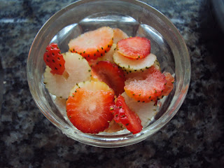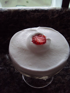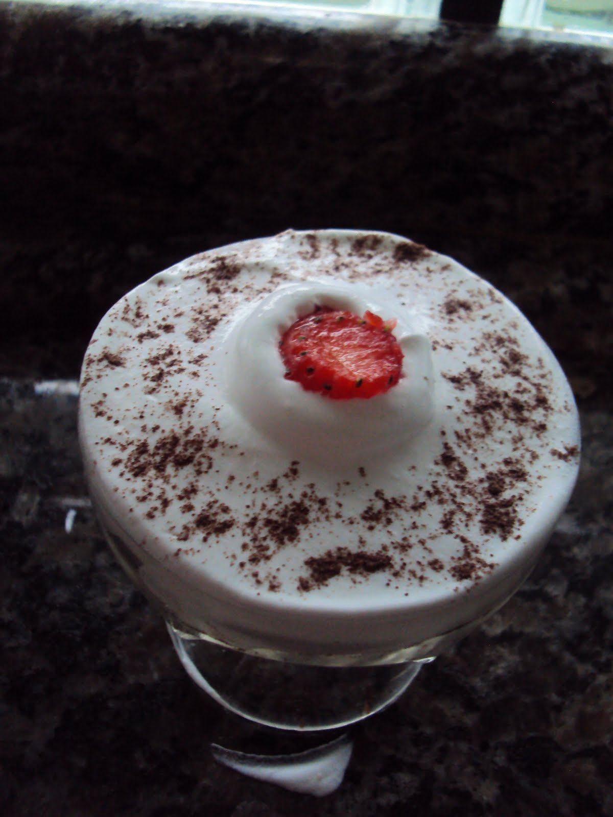 Para enfeitar, corte um pedaço de morango e coloque sobre o Chantilly.